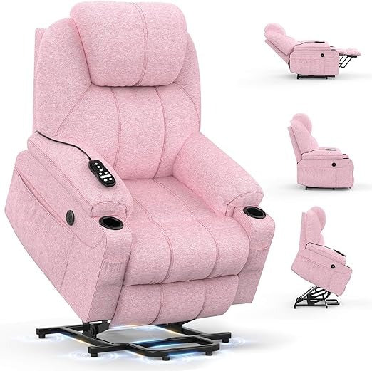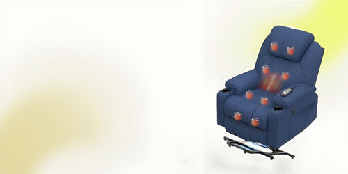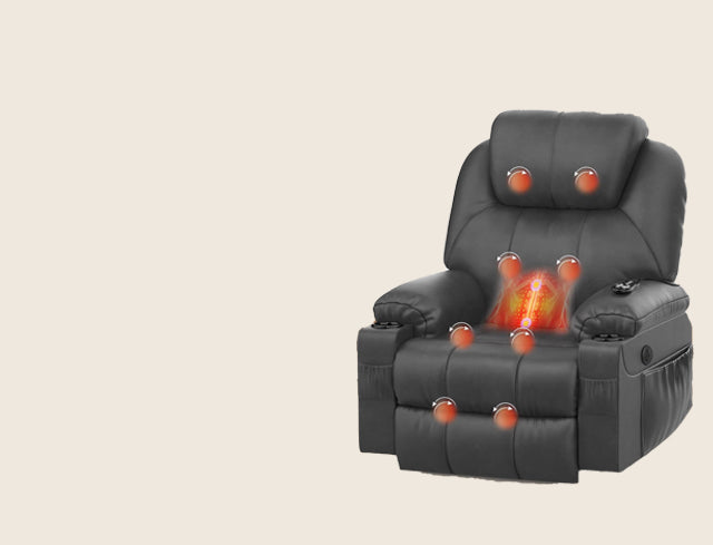 The COMFORT CARE Heated Massager Recliner combines innovation and comfort in one elegant design. Its motorized power-lift and recline mechanism smoothly transitions from a full recline of up to 135° to a standing position, making sitting and standing effortless. The chair’s 8-point massage system with adjustable heat promotes relaxation and improves blood circulation, while the extended footrest offers enhanced leg support—perfect for taller users and maintaining proper posture. For added convenience, built-in Type-C and USB charging ports keep your devices powered, and smart storage options, including dual cup holders and side pockets, ensure your essentials are always within reach.